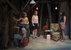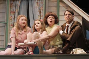 "Imagine that your baby sister has just died and you are immediately shipped off to an aunt who hasn’t the foggiest idea about how to console, show love to or please a child. That’s the fate of Willa Jo...and Little Sister...in the poignant and heartwarming Getting Near to Baby...Rita Giomi’s gifted cast gives full measure to...Y York’s fine stage adaptation of Audrey Couloumbis’ Newbery Honor book. The girls’ snobby Aunt Patty seems not to have a clue. For her, rules and cleanliness are far more important than compassion. She disdains the polite neighbor children, Liz ...and Isaac...because, with 14 people living in their house, they must be trash. Yet despite Aunt Patty, these kids manage to befriend the sisters and introduce them to the wonders of their playhouse/cave. Aunt Patty would prefer the sisters to take charm lessons from the superficial, social-climbing Lucy Wainwright and her mean-spirited daughter Cynthia...Of course, there are lessons in this play. True values are those that involve respect for other people, and revere good character rather than airs or social status. And much to the delight of the young people in the audience, the play makes it clear that children sometimes do indeed know more than the adults in their lives — and they have their own way of working through life’s tragedies. Aunt Patty has a lot to learn about children and about values...Buried under that exterior there is someone who is capable of love, someone who also mourns the baby..."